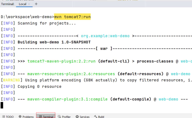 在 Terminal 命令行中,先使用 mvn tomcat7:run 启动项目,然后再使用 ctrl+c 关闭 Tomcat。