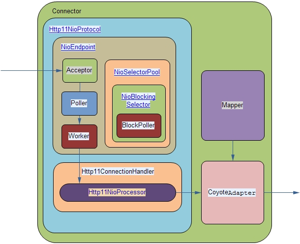 对照下面这张图,可以比较清晰的理解 Tomcat 的 Connector 和 nio 模型: