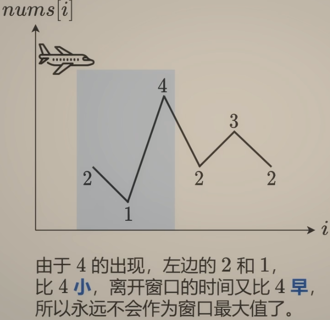 nums。对于每个元素,执行以下操作:- 检查队列的头部元素(即最大值候选)是否还在滑动窗口内。如果不在(即它是窗口左侧即将移出的元素),则从队列头部移除。