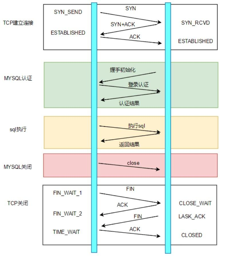 下面以访问 MySQL 为例,执行一个 SQL 命令,如果不使用连接池,需要经过哪些流程。