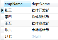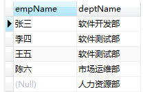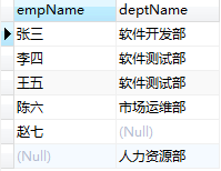 select e.empName,d.deptName from t_employee e left outer join t_dept d on d.id = e.dept;查询结果: