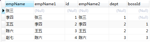 select e.empName,b.empName,b.* from t_employee e left join t_employee b on e.bossId=b.id;查询结果