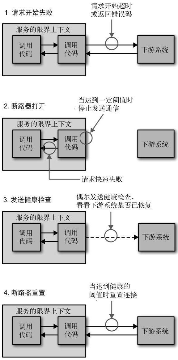 当一个服务因为各种原因停止响应时,调用方通常会等待一段时间,然后超时或者收到错误返回。如果调用链路比较长,可能会导致请求堆积,整条链路占用大量资源一直在等待下游响应。所以当多次访问一个服务失败时,应熔断,标记该服务已停止工作,直接返回错误。直至该服务恢复正常后再重新建立连接。