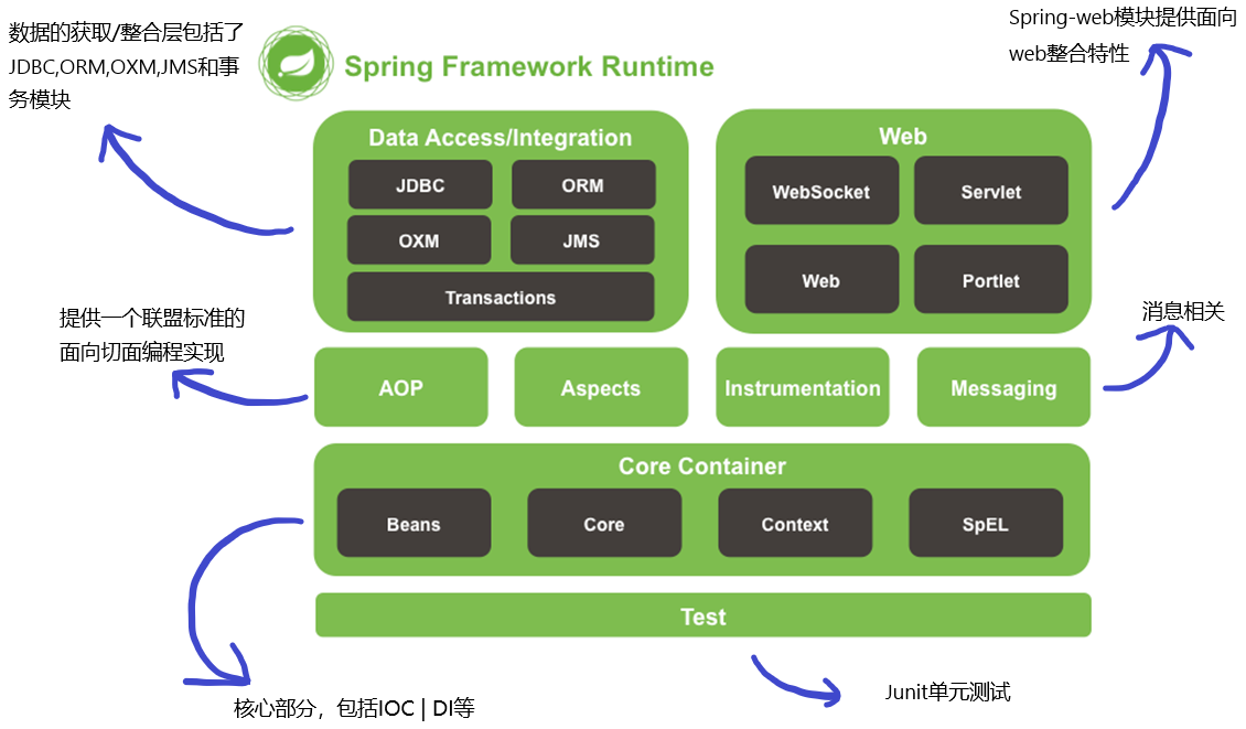 Spring以 IOC(Inversoin Of Control,控制反转)和 AOP(Aspect Oriented Programming,面向切面编程)为内核,使用基本的JavaBean来完成以前只可能由 EJB(Enterprise Java Beans,Java企业Bean)完成的工作。取代了EJB那臃肿、低效的开发模式