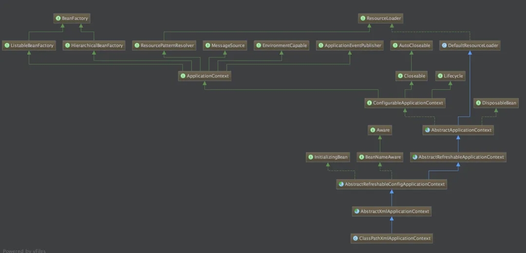 当我们点开 ClassPathXmlApplicationContext 时,发现它并不是直接继承 ApplicationContext 的,它有很多层的依赖关系,每层的子类都是对父类的补充实现。