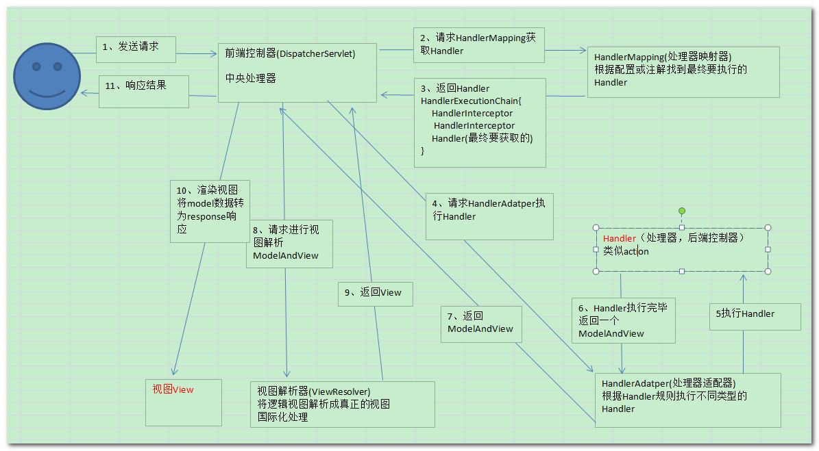 图为 SpringMVC 的一个较完整的流程图,实线表示SpringMVC框架提供的技术,不需要开发者实现,虚线表示需要开发者实现。