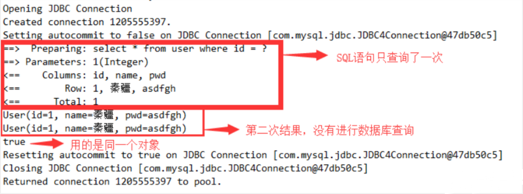 java@Test public void testQueryUserById(){ SqlSession session = MybatisUtils.getSession(); SqlSession session2 = MybatisUtils.getSession(); UserMapper mapper = session.getMapper(UserMapper.class); UserMapper mapper2 = session2.getMapper(UserMapper.class); User user = mapper.queryUserById(1); System.out.println(user); session.close(); User user2 = mapper2.queryUserById(1); System.out.println(user2); System.out.println(user==user2); session2.close(); }