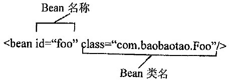 一般情况下,Spring IOC容器中的一个Bean即对应配置文件中的一个 <bean> ,这种镜像对应关系应该容易理解。其中id为这个Bean的名称,通过容器的getBean("foo")即可获取对应的Bean,在容器中起到定位查找的作用,是外部程序和Spring IOC容器进行交互的桥梁。class属性指定了Bean对应的实现类。