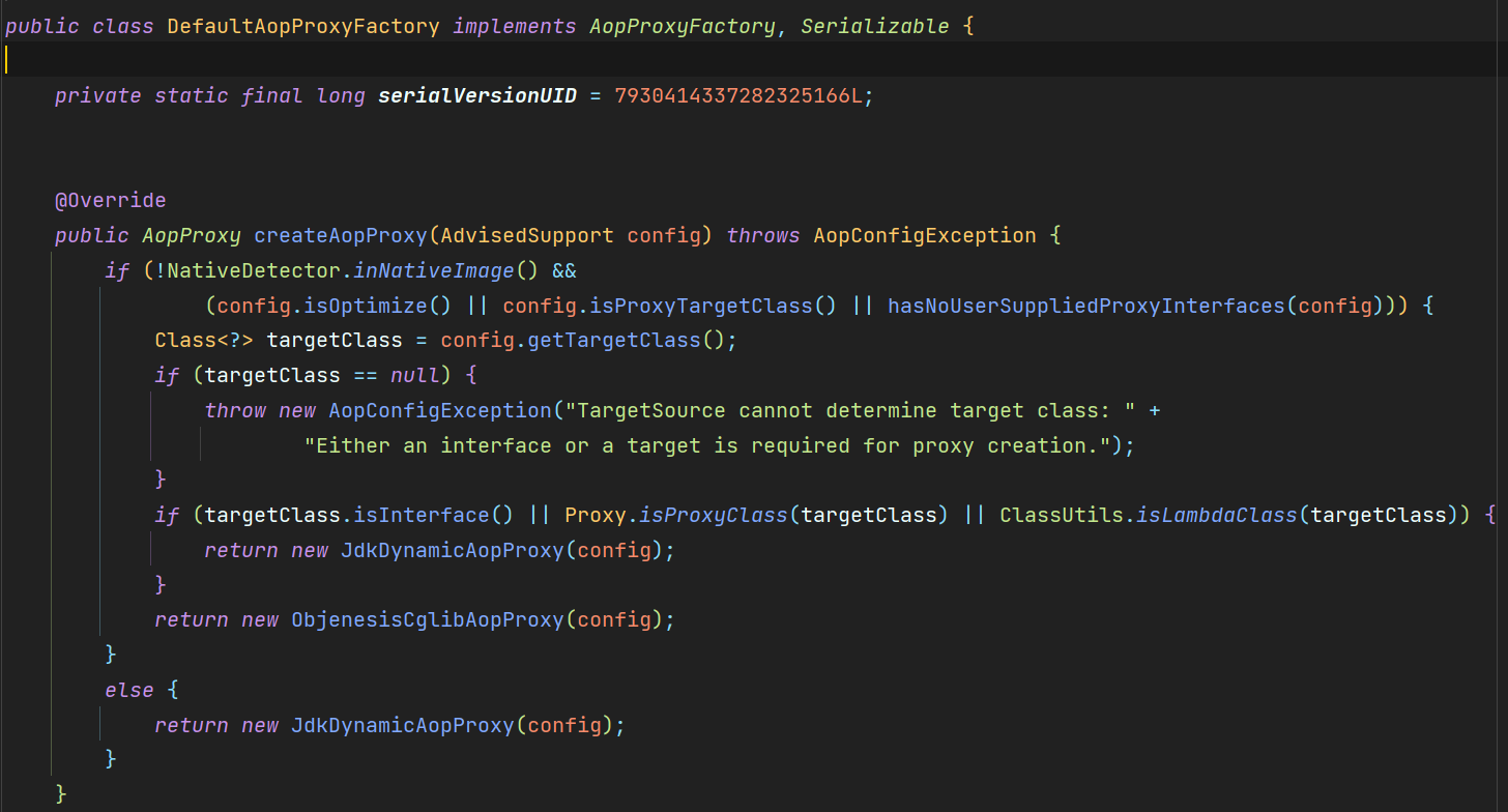 通过查看 Spring 源码,我们在 DefaultAopProxyFactory 类中,找到这样一段话: