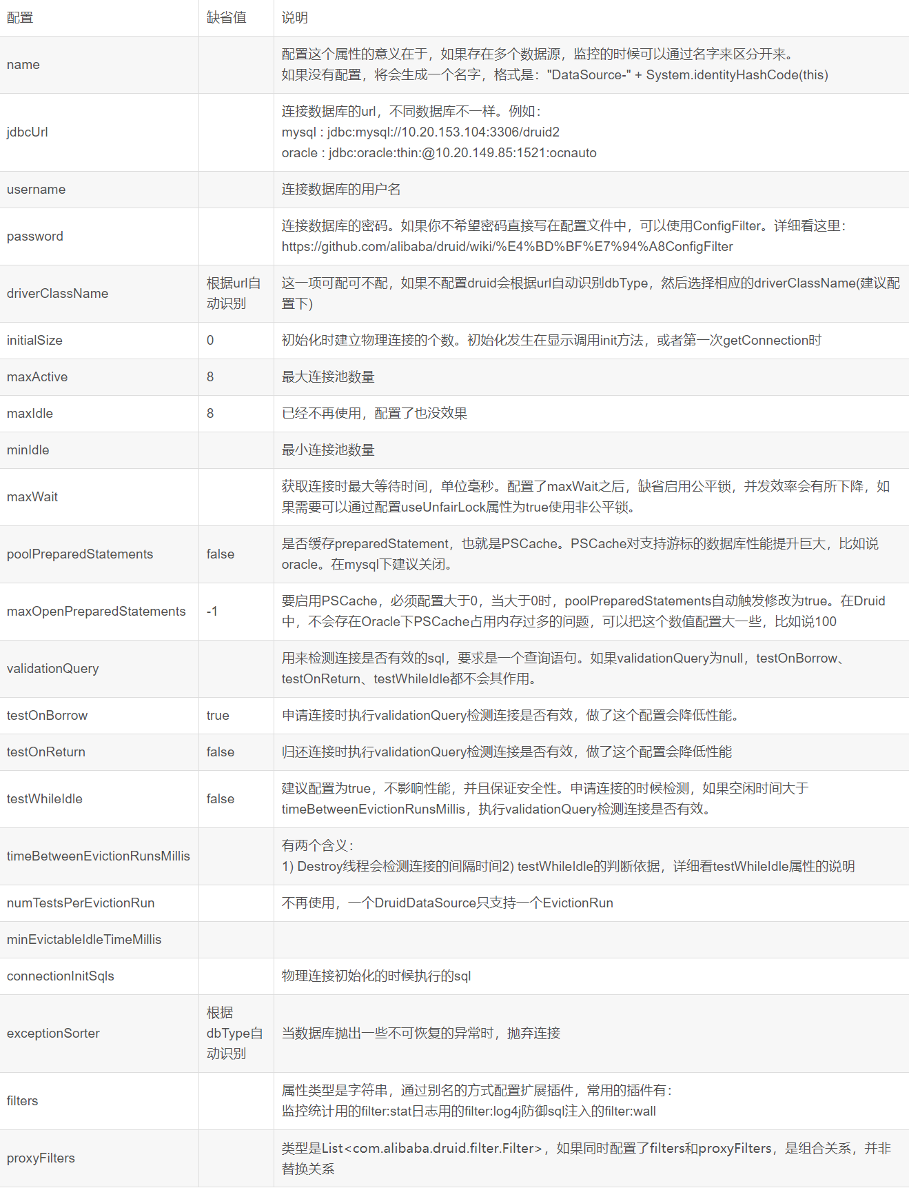 和其它连接池一样,Druid的DataSource类为:com.alibaba.druid.pool.DruidDataSource,基本配置参数如下: