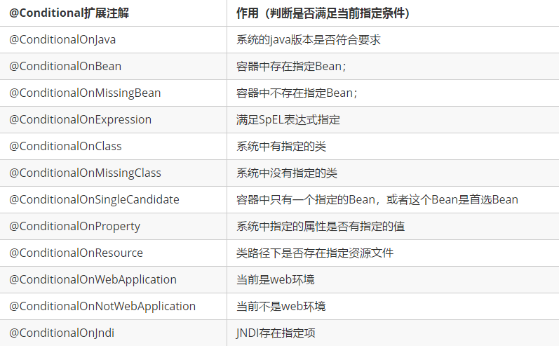 //根据不同的条件判断,如果满足指定的条件,整个配置类里面的配置就会生效;