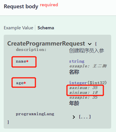 注意红框中的内容,name 和 age 右上角都有出现了一个红色的星星,表示是必填的,age也被限制了范围。
