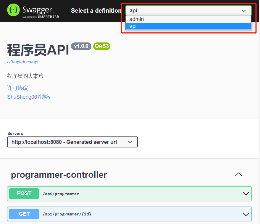 假如你有两类 controller,一类以 /api 为前缀,一类以 /admin 为前缀,就可以将其配置为两个分组