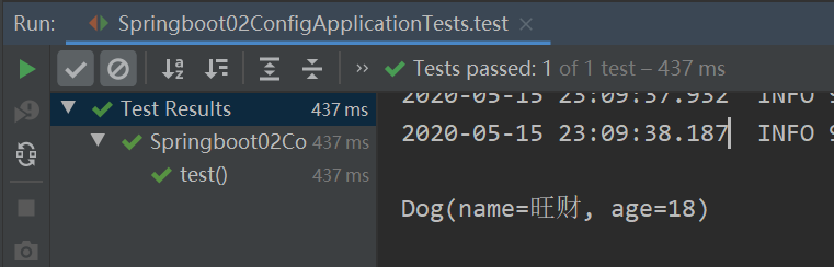 java@SpringBootTestclass DemoApplicationTests { @Autowired //将狗狗自动注入进来 Dog dog; @Test public void contextLoads() { System.out.println(dog); //打印,看下狗狗对象 } }