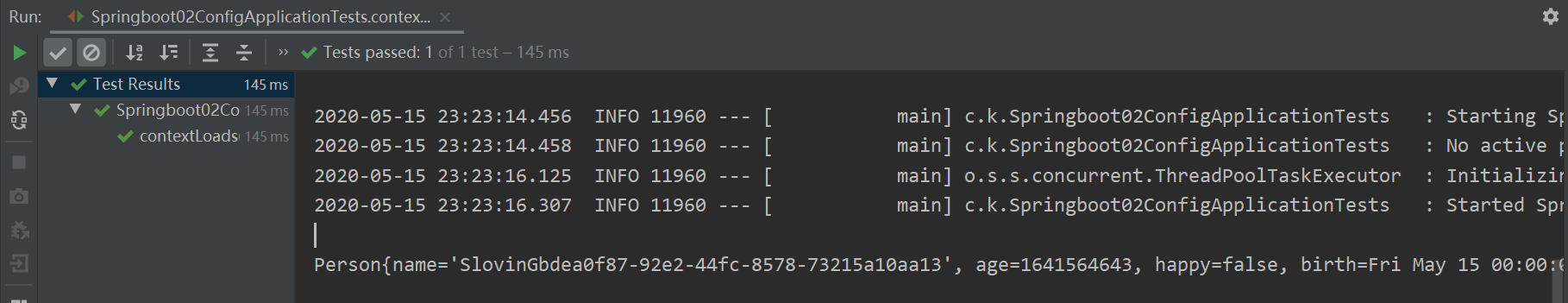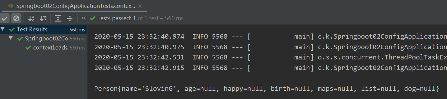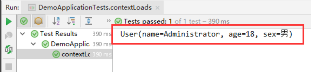 java@SpringBootTest class DemoApplicationTests { @Autowired Person person; //将person自动注入进来 @Test public void contextLoads() { System.out.println(person); //打印person信息 } }